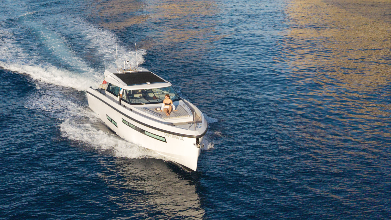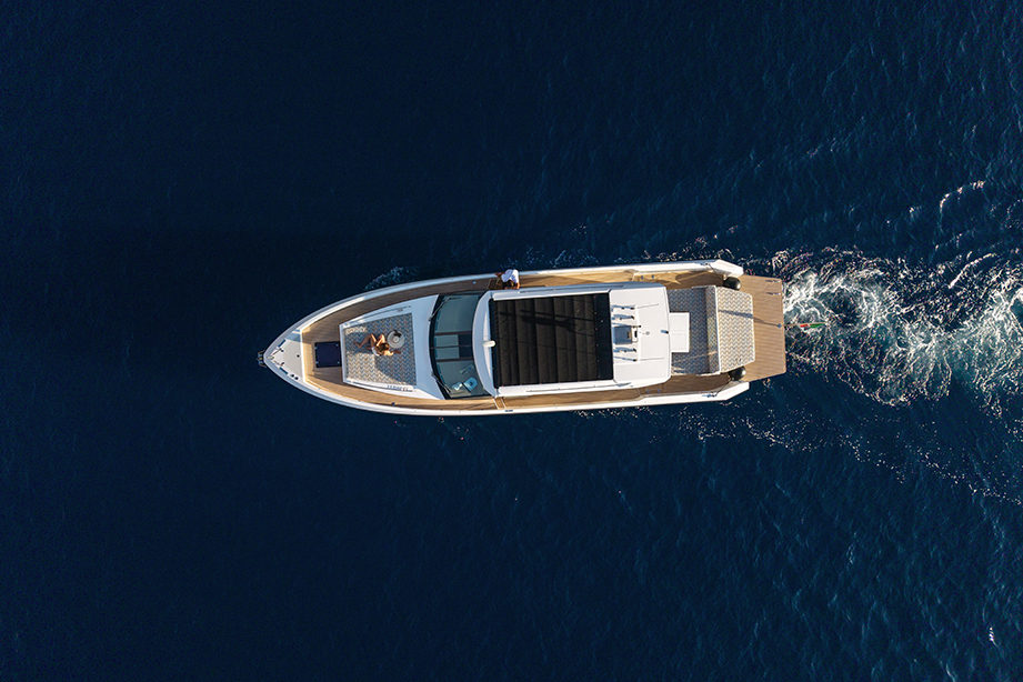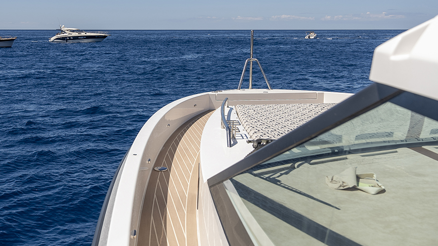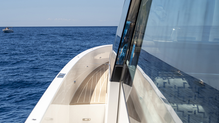 Exterior Design: Features the distinctive 'sidewalk' deck layout for ease of movement. The large electric sunroof allows the cockpit to transition seamlessly from a protected lounge to an open terrace.