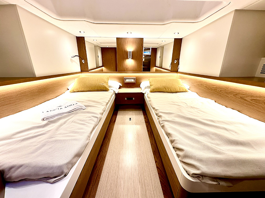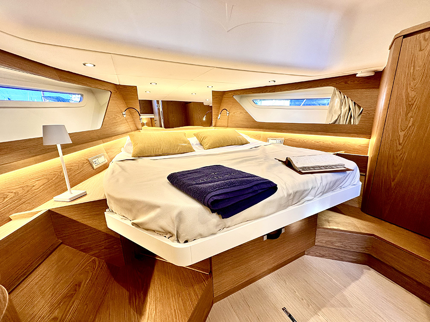 Deck: The deck is spacious and step-free, designed for en plein air living. It features two large sundecks (at the bow and stern), a bow sofa convertible into a sundeck for four, and a Hard Top for protection over the social areas.