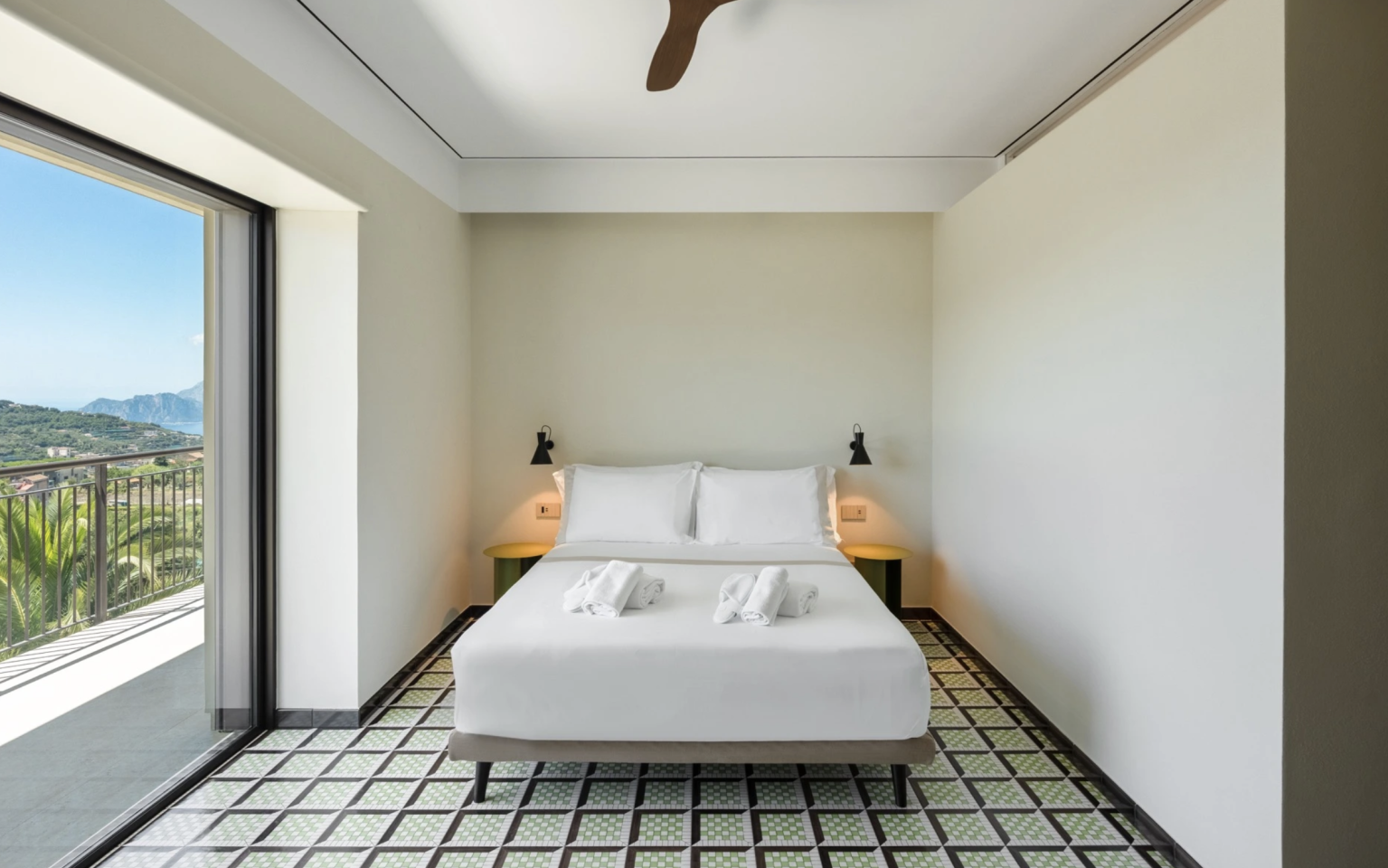 The villa spans three floors plus a rooftop terrace, totaling approximately 500 sqm. On the ground floor, there is a large dining room with a beautiful table seating up to 18 people, a living area equipped with sofas, a 52-inch satellite TV, and a stunning designer electric fireplace to keep you warm on cooler evenings. Completing this floor are a guest bathroom and a beautiful, fully equipped kitchen with an American fridge, oven, microwave, and a wine cellar featuring an extensive selection of top Italian wineries. On the first floor, there are two double bedrooms with full bathrooms and large walk-in showers, and a suite consisting of a double bedroom and a living room with a double sofa bed and an en-suite bathroom. The center of the room is dominated by a beautiful bathtub where you can relax at any time during your stay. The second floor is identical to the first, with three rooms laid out in the same way; only the color of the splendid Vietri tiled flooring changes. The structure is completed by a magnificent terrace equipped with sun loungers and an outdoor shower, where you can practice yoga at sunset or sunrise while admiring the island of Capri right in front of you.
